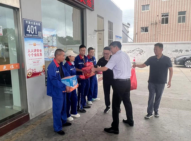 活動(dòng)中,物資集團(tuán)和新倫石化公司負(fù)責(zé)人一行來到大徐、金達(dá)加油站,為一線職工送上防暑降溫物品,關(guān)切詢問大家的日常工作情況,叮囑他們?cè)诟邷仄陂g要合理安排作業(yè)時(shí)間,注重勞逸結(jié)合,做好個(gè)人防護(hù)。隨后,物資集團(tuán)負(fù)責(zé)人詳細(xì)了解加油站經(jīng)營(yíng)銷售情況,并要求現(xiàn)場(chǎng)管理人員切實(shí)做好防暑降溫措施和防汛工作,加強(qiáng)對(duì)加油機(jī)、油罐區(qū)、配電室等設(shè)備設(shè)施的日常巡查,及時(shí)消除安全隱患,營(yíng)造平安穩(wěn)定的工作環(huán)境。