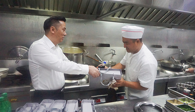 活動中,國投大酒店負責人帶領經理層成員,為堅守在高溫一線的職工送上了清涼解暑慰問品,并叮囑他們要注意勞逸結合、做好自我防護。隨后,酒店負責人詳細了解各一線崗位的防暑降溫措施、人員排班等情況,要求相關負責同志堅決守牢安全底線,合理安排作業(yè)時間,普及好防暑降溫和急救知識,切實做好高溫時節(jié)各項工作,確保職工的健康和安全。