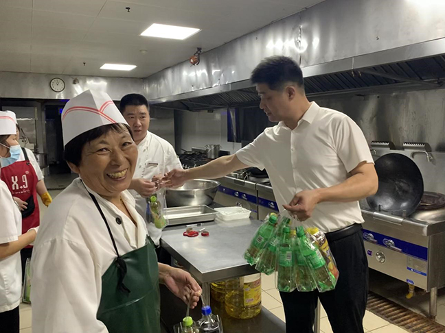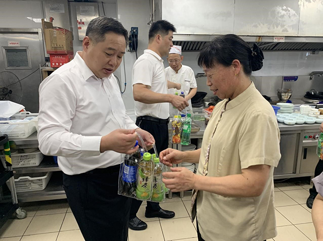 劉晉國一行為堅守在高溫一線的職工們送上慰問品,并察看了酒店餐飲接待服務、廚房菜肴出品、工程施工作業(yè)和康體中心安全管理等方面工作情況。每到一處,劉晉國都同一線職工親切交談,詳細了解防暑降溫和日常工作情況,對他們的愛崗敬業(yè)精神表示充分肯定,反復叮囑大家要注意勞逸結合、加強自我防護,同時要求各部門積極創(chuàng)造條件,改善工作環(huán)境,把防暑降溫工作做細做實做到位,不斷提升職工的獲得感、幸福感和歸屬感。