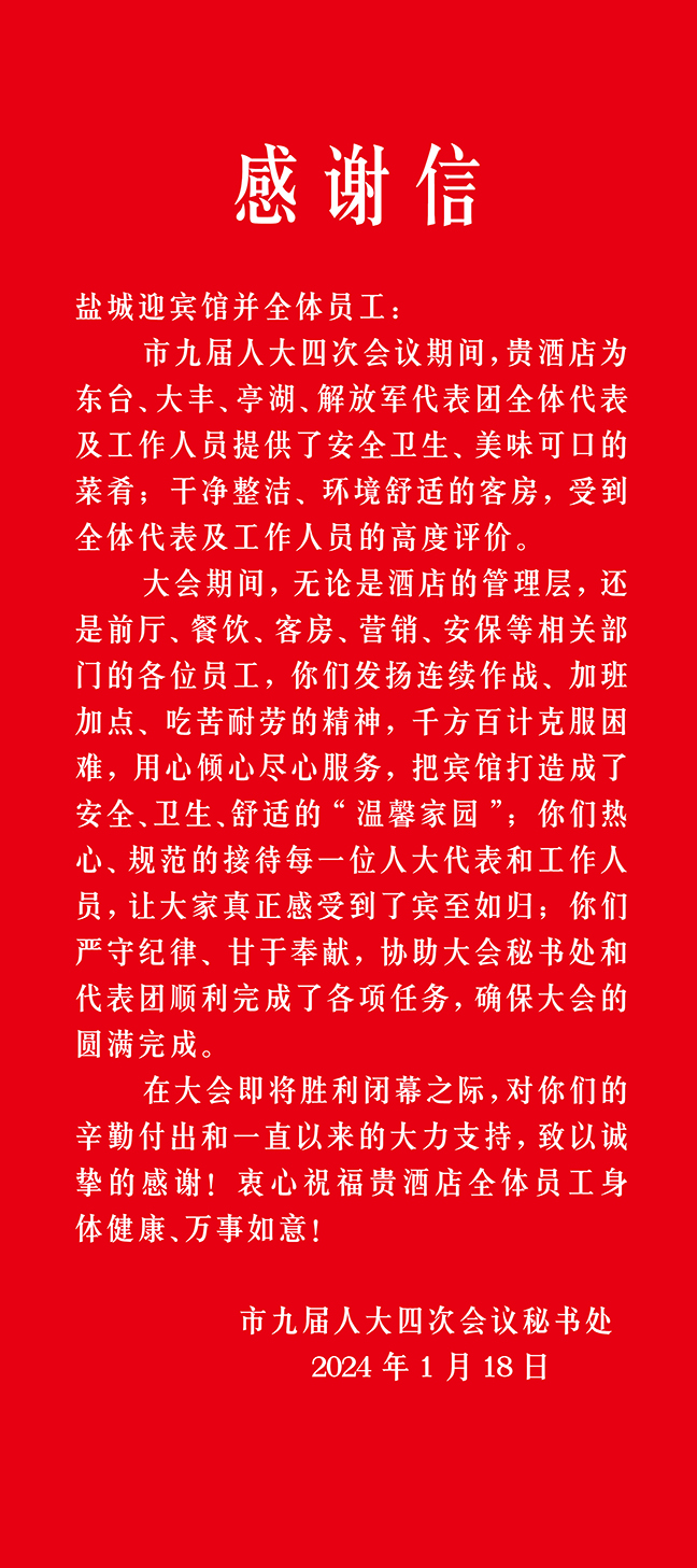 本次服務(wù)保障工作的圓滿完成,為酒店接待工作進(jìn)一步積累了寶貴經(jīng)驗(yàn),也檢驗(yàn)了全體員工的專業(yè)素養(yǎng)和職業(yè)技能。會(huì)后,大會(huì)秘書處、解放軍代表團(tuán)、亭湖代表團(tuán)、大豐代表團(tuán)、東臺(tái)代表團(tuán)等紛紛發(fā)來感謝信共計(jì)76封,對(duì)酒店接待服務(wù)保障工作給予高度評(píng)價(jià)。鹽城迎賓館將認(rèn)真總結(jié)成功經(jīng)驗(yàn),牢固樹立“服務(wù)第一、品牌優(yōu)先”的經(jīng)營理念,不斷在優(yōu)化服務(wù)品質(zhì)和服務(wù)細(xì)節(jié)上下功夫,持續(xù)提升管理水平和服務(wù)質(zhì)量。